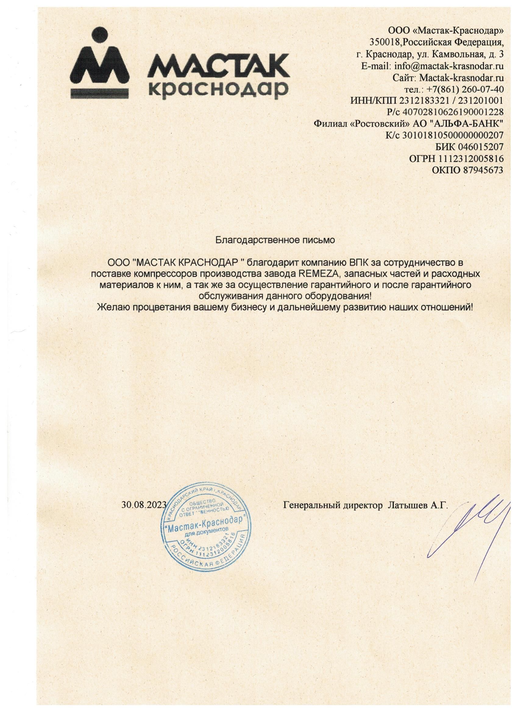 ООО "МАСТАК КРАСНОДАР" благодарит Холдинг ВПК за сотрудничество в поставке компрессоров производства завода REMEZA, запасных частей и расходных материалов к ним, а так же за осуществление гарантийного и постгарантийного обслуживания данного оборудования!