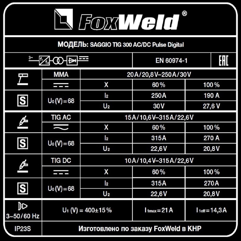 Сварочные инверторы TIG Fox Weld SAGGIO TIG 300 AC/DC Pulse Digital: характеристики